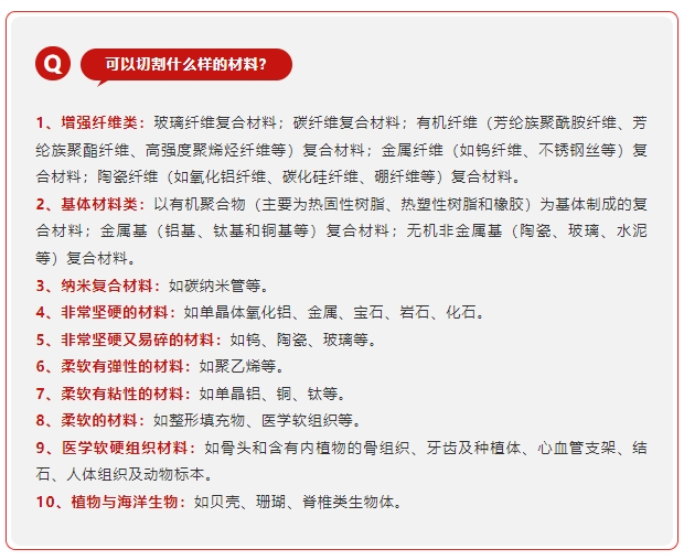• 可切割樹脂基復(fù)合材料、陶瓷基復(fù)合材料、金屬基復(fù)合材料、熱塑性和熱固性復(fù)合材料等