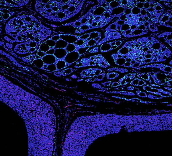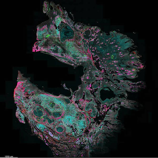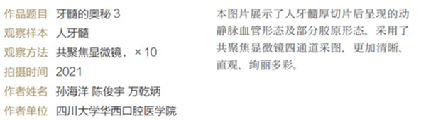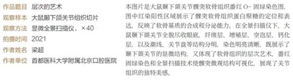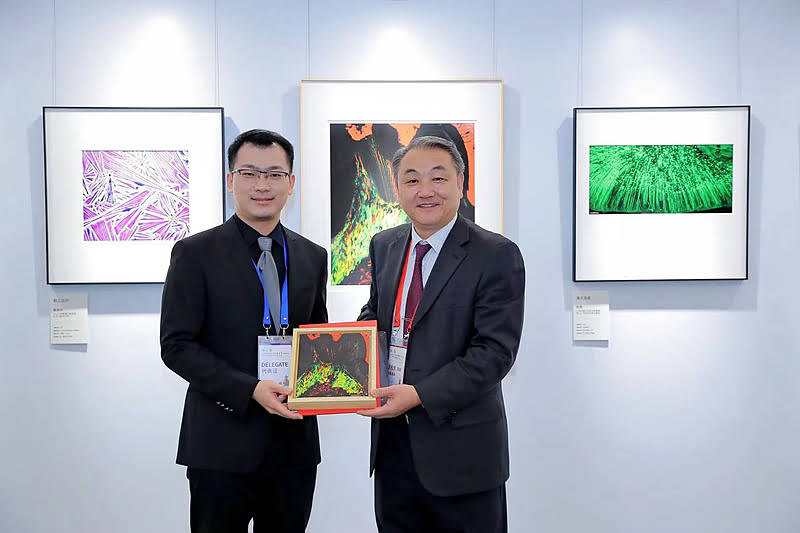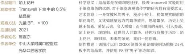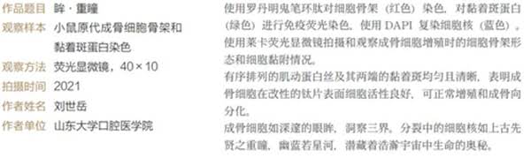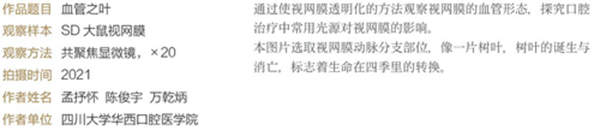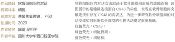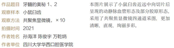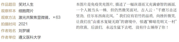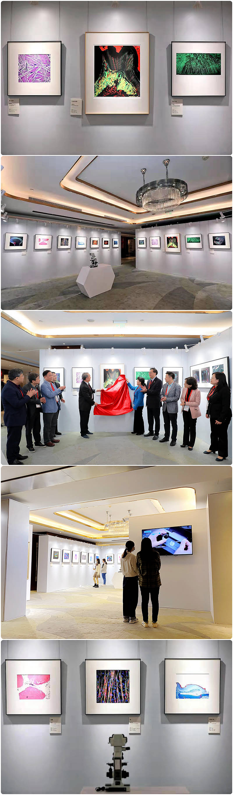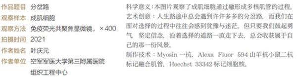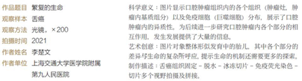 這些作品幾乎均為創(chuàng)作者在日??蒲泄ぷ髦幸圆煌募夹g(shù)手段捕捉到的微觀生命瞬間,科學(xué)的“透鏡”似乎為我們展現(xiàn)出一幅幅藝術(shù)的“魔幻”,一邊是細胞、分子層面的微觀抵達,另一邊好似一塊既陌生又熟悉的“優(yōu)詩美地”。這里,本是科學(xué)嚴謹?shù)念I(lǐng)地,因為其關(guān)乎生靈,便開啟人們自由逸放的審美思緒。在此,我們驚嘆中國古代哲學(xué)體系中“天人合一、道法自然”的天道規(guī)律。原來早于現(xiàn)代科學(xué),這種“盡精微而致廣大”的宇宙觀便已根植于我們生存的大地。感謝各位作者以他們現(xiàn)代技術(shù)的視野,為我們定格生命律動的瞬間,張揚蓬勃的藝術(shù)活力。換一個視角,生命的風景便呈現(xiàn)“天地人”的和諧和統(tǒng)一,換一種思路,生命的哲學(xué)便更能詮釋苦難與幸福的非凡境遇。