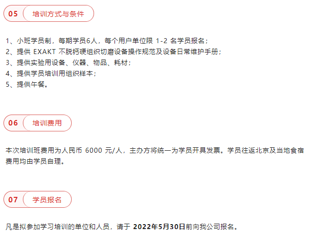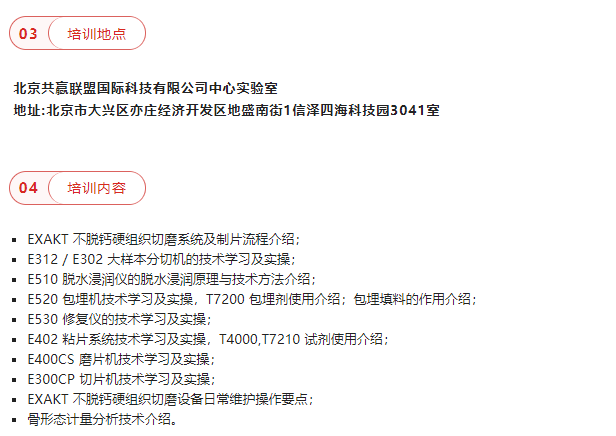 為了幫助 EXAKT 用戶更好地了解不脫鈣硬組織切磨技術(shù)、制片流程、設(shè)備操作及維護(hù)相關(guān)的技術(shù)知識(shí),切實(shí)提高用戶老師切磨技術(shù)的實(shí)操經(jīng)驗(yàn)。由北京共贏聯(lián)盟國際科技有限公司主辦的“第二期 EXAKT 不脫鈣硬組織切磨系統(tǒng)操作及維護(hù)技術(shù)培訓(xùn)班”預(yù)計(jì)在 2022 年 10月 17 日在北京舉辦,特邀各位專家老師參加學(xué)習(xí)和培訓(xùn),相關(guān)事宜安排如下: