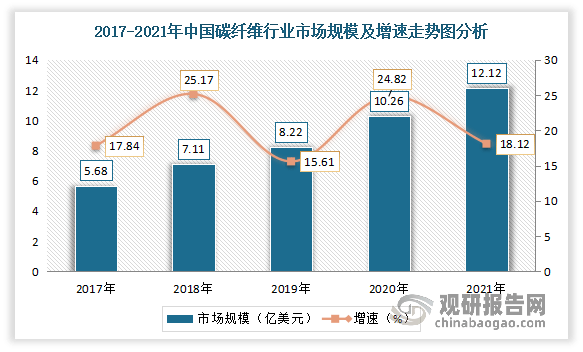 自2017年以來(lái),我國(guó)碳纖維市場(chǎng)規(guī)模一直保持增長(zhǎng)趨勢(shì)。數(shù)據(jù)顯示,2020年,我國(guó)碳纖維市場(chǎng)規(guī)模為10.26億美元,同比增長(zhǎng)24.82%;2021年我國(guó)碳纖維市場(chǎng)規(guī)模12.12億美元,同比增長(zhǎng)18.12%。