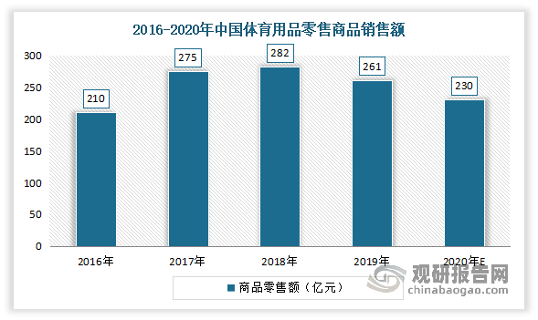 2016-2018年中國(guó)體育用品零售商品銷售額逐年增加,2019年中國(guó)體育用品零售商品銷售額達(dá)到261億元。新冠肺炎疫情對(duì)我國(guó)體育用品行業(yè)造成一定的影響,人們參與相關(guān)戶外體育活動(dòng)的大幅降低。結(jié)合行業(yè)經(jīng)營(yíng)環(huán)境及行業(yè)營(yíng)收情況預(yù)計(jì),2020年中國(guó)體育用品零售商品零售額在230億元左右。具體如下:
