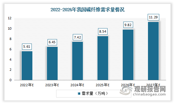 受益于下游風(fēng)電葉片、航空行業(yè)、汽車制造等市場(chǎng)的發(fā)展,我國(guó)碳纖維的需求也將能得到較好的釋放。而按照近年來(lái)中國(guó)碳纖維需求量保持持續(xù)增長(zhǎng)態(tài)勢(shì),估計(jì)“十四五”期間中國(guó)碳纖維需求量將保持15%以上的增長(zhǎng)速度,到2026年中國(guó)碳纖維需求量將達(dá)到11.29萬(wàn)噸左右。