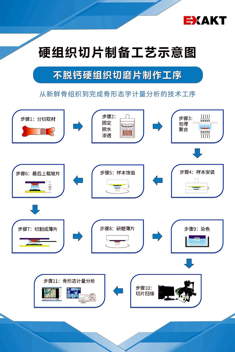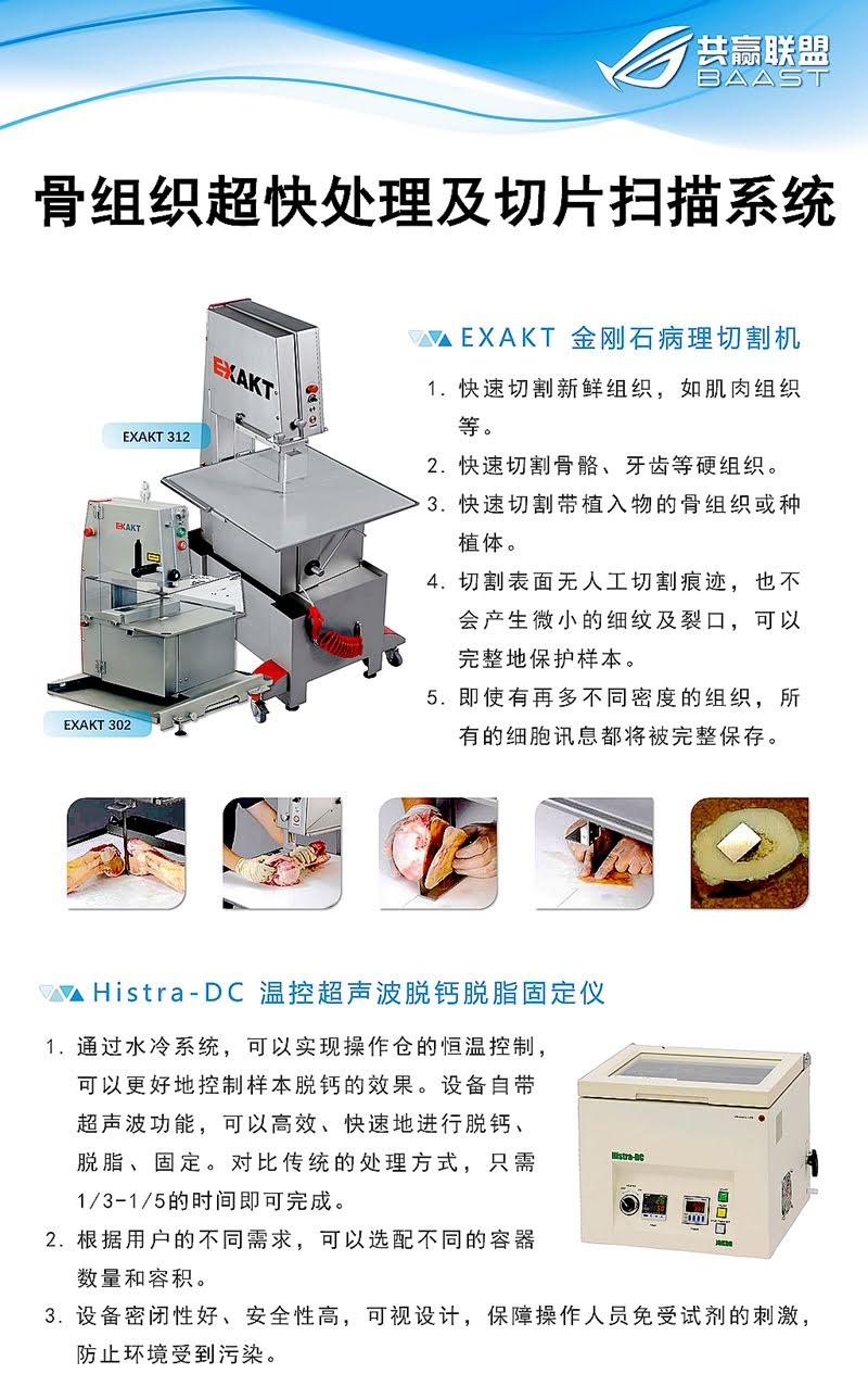 ②EXAKT生物醫(yī)學(xué)硬組織切磨系統(tǒng),EXAKT切磨系統(tǒng)是將不能用常規(guī)設(shè)備制備成組織切片的軟硬組織標(biāo)本制成不脫鈣醫(yī)學(xué)組織切片,并保持軟硬組織、組織與植入物之間的原有組織結(jié)構(gòu)形態(tài)。該切磨系統(tǒng)特殊的技術(shù)設(shè)計、技術(shù)配置以及獨特的工藝方法,均與常規(guī)設(shè)備和工藝不同。新鮮的醫(yī)學(xué)組織標(biāo)本經(jīng)過取材固定及脫水處理后,用光固化樹脂浸透、包埋、再行鋸片、磨片、染色等步驟制成厚約 10μm的醫(yī)學(xué)組織切片。采用 EXAKT 切磨系統(tǒng)設(shè)備制備的醫(yī)學(xué)軟硬組織切磨片在顯微鏡下能夠清楚準(zhǔn)確地觀察到組織的微觀結(jié)構(gòu)及其之間的相互關(guān)系。EXAKT切磨系統(tǒng)設(shè)備能為醫(yī)學(xué)軟硬組織疾病的科學(xué)研究、新材料的生物相容性研究和嵌入物研究以及醫(yī)學(xué)院教學(xué)等提供可靠的組織學(xué)評價依據(jù)。