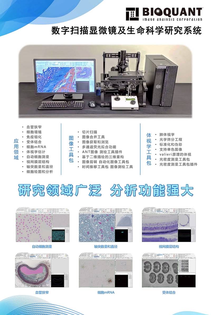 ③數(shù)字掃描顯微鏡及生命科學(xué)分析系統(tǒng),BIOIMAGER是由世界上非常先進(jìn)的數(shù)字掃描顯微鏡和圖像管理與專業(yè)化測量分析軟件組成。能夠?qū)⒉±砬衅瑯颖緩膶嵨镄问睫D(zhuǎn)化為數(shù)據(jù)圖像,用于測量和分析,還可以直接測量分析來自MicroCT、2DX-ray、掃描儀、相機等數(shù)據(jù)圖像,自動批量處理、信息校正與保存、數(shù)據(jù)管理和輸出。在現(xiàn)代病理學(xué)、組織工程學(xué)、生物學(xué)和生命科學(xué)研究中,滿足高效率、可存儲、即時分析、安全共享、教學(xué)、遠(yuǎn)程會診等需求。