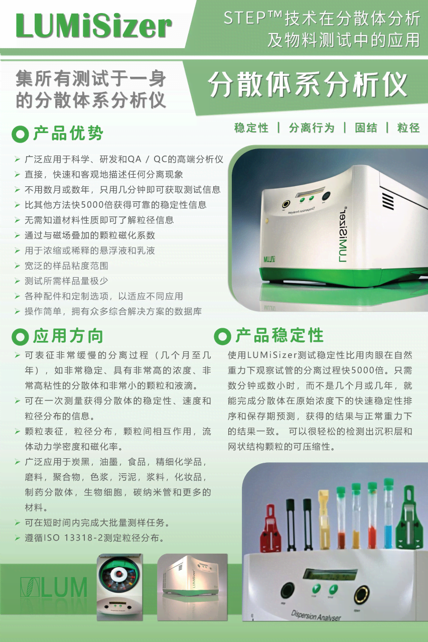 1、可表征非常緩慢的分離過程(幾個月至幾年),如非常穩(wěn)定、具有非常高的濃度、非常高粘性的分散體和非常小的顆粒和液滴。