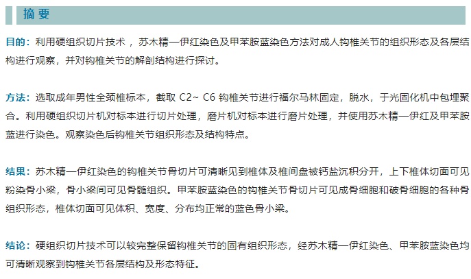 選取 1 例成年男性全頸椎標(biāo)本,截取 C2~ C6 鉤椎關(guān)節(jié)進(jìn)行脫水固定包埋。蘇木精—伊紅試劑盒,甲苯 胺藍(lán)試劑盒,光固化機(jī),德國 EXAKT300CP 硬組織切片機(jī),德國EXAKT400S 磨片機(jī),福爾馬林液,梯度乙醇( 70% ~ 95% ) ,無水乙醇,Technovit 7200 樹脂液,320 目、800 目、1200目、4000 目砂紙。