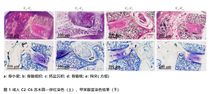 為研究鉤椎關(guān)節(jié)組織形態(tài)學(xué)結(jié)構(gòu),本實(shí)驗(yàn)將蘇木精—伊紅染色和甲苯胺藍(lán)染色作為基本染色法,結(jié)合 硬組織切片技術(shù)對鉤椎關(guān)節(jié)形態(tài)學(xué)結(jié)構(gòu)進(jìn)行探討。硬 組織切片技術(shù)能夠完整地保留骨組織原本的結(jié)構(gòu)及成 分,因此已成為目前最常用的觀察骨組織的方式。其對于不脫鈣的骨組織切片具有極佳的適配性,對研究骨組織成分以及骨形成有重要作用[13],對于了解生長發(fā)育及組織構(gòu)成具有極大意義。既往文獻(xiàn)發(fā)現(xiàn),蘇木精—伊紅染色可避免因?yàn)殁}的存在而受影響的骨組織切片[14-16]。蘇木精—伊紅染色作為標(biāo)準(zhǔn)的染色方法, 可將胞質(zhì)內(nèi)的核糖體及細(xì)胞核內(nèi)的染色質(zhì)染成紫藍(lán)色,將細(xì)胞質(zhì)染成紅色[17-18],該染色法通過陰陽離子互相結(jié)合,可起到加強(qiáng)固定效果[19]。在識(shí)別各種潛在的惡性病變中,甲苯胺藍(lán)是一種實(shí)用且有效的輔助診斷工具[20-21],其吩噻嗪類堿性染料的特征可將細(xì)胞核染成藍(lán)色[22-23]。本研究在對鉤椎關(guān)節(jié)的觀察中采用蘇木精—伊紅染色和甲苯胺藍(lán)染色,在保留骨組織結(jié)構(gòu)的情況下簡化了實(shí)驗(yàn)步驟,又避免了脫鈣失敗對鉤椎關(guān)節(jié)切片和染色的影響,兩種染色方法相結(jié)合,可見鉤椎關(guān)節(jié)骨小梁體積、寬度及分布均勻正常,骨髓組織分布于骨小梁之間,鈣鹽沉積在周圍結(jié)締組織與椎體相通處,上下椎體和椎間盤間隔鮮明。
