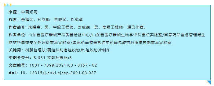 GB/T16886.6-2015 醫(yī)療器械生物學(xué)評價標(biāo)準(zhǔn)中提到對植入物的評價,要特別關(guān)注組織與材料之間的界面,且該標(biāo)準(zhǔn)推薦采用硬組織制片技術(shù)進行組織切片制作[4]。對埋置有種植體的組織標(biāo)本進行制片時,硬組織切磨技術(shù)可以直接切含有堅硬植入物的組織標(biāo)本,而普通的石蠟包埋組織切片需要先剔除組織內(nèi)埋置的植入物,這往往會使原有的組織結(jié)構(gòu)形態(tài)發(fā)生改變,無法客觀的評價植入物與周邊組織的結(jié)合情況,影響后期的評價分析。骨組織是由大量鈣化的細(xì)胞間質(zhì)和骨組織細(xì)胞組成,為結(jié)締組織的一種,因細(xì)胞間質(zhì)內(nèi)有大量鈣鹽沉積,故骨組織質(zhì)地十分堅硬,石蠟包埋組織切片必須對骨組織進行脫鈣處理[6-8]。脫鈣會使組織細(xì)胞皺縮,同時會使骨的礦化結(jié)構(gòu)遭到破壞,而硬組織切磨技術(shù)無需脫鈣處理,完整的保存了骨組織的礦化結(jié)構(gòu),組織切片經(jīng)染色處理后,可用于研究骨修復(fù)材料植入后的骨組織形態(tài)計量學(xué)及骨整合相關(guān)的研究。雖然樹脂包埋硬組織制片也存在不足,如制片過程復(fù)雜,制片操作步驟繁瑣,盡管存在難點,但硬組織切磨技術(shù)能夠保持種植體與周邊組織界面的組織結(jié)構(gòu),可直觀反應(yīng)結(jié)合界面的生長結(jié)合情況,是目前研究種植體-組織結(jié)合界面重要的技術(shù)方法。