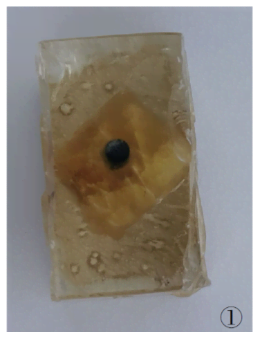 1.3.5 光固化包埋聚合取出浸透完全的標(biāo)本,將需要觀察的組織切面向下置入塑料包埋模具中,加入Technovit 7200VLC光聚樹脂,利用EXAKT 530 干燥滲透聚合裝置抽真空,排凈組織塊內(nèi)殘存的氣泡。固化過程由低強度的黃光與高強度的藍(lán)光共同輻照完成,先黃光輻照6h,后藍(lán)光輻照8h,經(jīng)輻照光固化聚合后埋置有CF/PEEK 復(fù)合材料的肌肉組織樹脂包埋塊(圖1)。