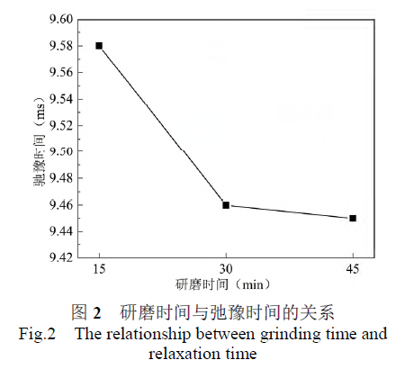 采用低溫納米材料制備分散機對原始漿料納米均質(zhì)分散,將分散好的漿料進(jìn)行三輥研磨,研磨時間分別為15分鐘、30分鐘、45分鐘,將研磨后的漿料進(jìn)行過濾,制備好的電子漿料按照1.3.4進(jìn)行漿料分散性的測試,弛豫時間如圖2所示。