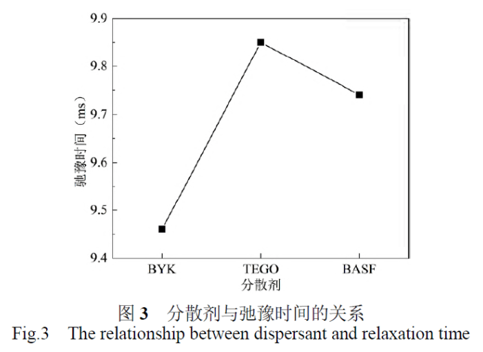 分別添加了相同含量的BYK、TEGO、BASF三種不同分散劑,配制成原始漿料。低溫納米材料制備分散機對原始漿料進(jìn)行納米均質(zhì)分散,將分散好的漿料進(jìn)行三輥研磨和過濾,制備好的電子漿料按照1.3.4進(jìn)行漿料分散性的測試,弛豫時間如圖3所示。