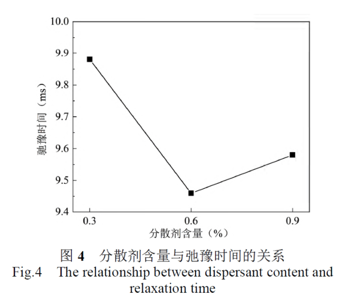 用滴管分別吸取已制備好漿料0.5mL,裝到測試的試管容器中,將石英試管插入儀器中,采用低場核磁共振儀進(jìn)行測試,得到漿料的弛豫時間。低場核磁共振儀的磁場強度為0.3T,頻率為13MHZ,溫度為25℃。