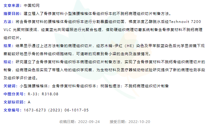 植入了骨修復(fù)材料的小型豬腰椎椎體不脫鈣病理組織切片制備方法 來(lái)源:本站 時(shí)間:2023-07-19 00:00:00