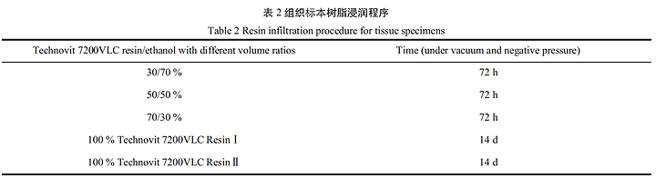 骨組織標(biāo)本采用石蠟包埋法進(jìn)行病理切片制作時(shí),必須先用乙二胺四乙酸二鈉(EDTA)、硝酸、甲酸等脫鈣液對(duì)骨組織標(biāo)本進(jìn)行脫鈣處理[6-8]。在骨組織內(nèi)埋置有植入物的情況下石蠟包埋組織切片并不適用,原因是硬化后的石蠟雖具有一定的硬度,但其硬度不足以支撐去切組織內(nèi)包埋的植入物,切片過(guò)程會(huì)造成蠟塊碎裂[9-11]。