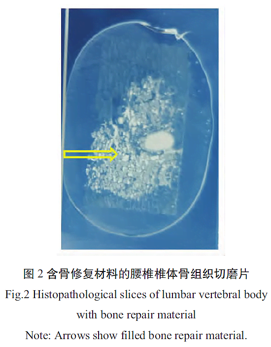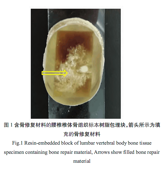用于骨修復(fù)的生物材料及器械在進(jìn)行臨床試驗(yàn)前均需要進(jìn)行臨床前安全性和有效性動(dòng)物試驗(yàn)研究,以預(yù)測(cè)其應(yīng)用于臨床可能發(fā)生的不良作用[1,2]。骨修復(fù)材料的動(dòng)物試驗(yàn)研究需要制備合適的骨缺損動(dòng)物模型,將骨修復(fù)材料植入到制備的骨缺損區(qū)域,評(píng)價(jià)骨缺損部位的局部炎癥反應(yīng)、骨整合程度、骨重建情況,對(duì)該骨修復(fù)材料的安全性及有效性進(jìn)行評(píng)價(jià)[3,4]。生物材料及醫(yī)療器械動(dòng)物試驗(yàn)周期結(jié)束后,需要剖檢、取樣,切取連帶植入物及其周邊骨組織進(jìn)行病理組織切片制備,以觀察生物材料及醫(yī)療器械與宿主骨組織結(jié)合界面的結(jié)合情況及其在動(dòng)物體內(nèi)的吸收降解情況。與普通的石蠟包埋組織切片制備方法相比,埋置有植入物的骨組織標(biāo)本進(jìn)行組織切片制備時(shí)采用樹(shù)脂包埋病理組織切片制備方法不需要進(jìn)行脫鈣處理,不需要額外剔除組織內(nèi)埋置的植入物,可完整的觀察到植入物與宿主骨組織結(jié)合界面的組織反應(yīng)情況,實(shí)現(xiàn)對(duì)植入物與骨組織結(jié)合界面組織細(xì)胞學(xué)變化的研究。本研究對(duì)植入了骨修復(fù)材料小型豬腰椎椎體不脫鈣病理組織切片制備方法進(jìn)行了研究,以期能為相關(guān)研究人員提供參考。