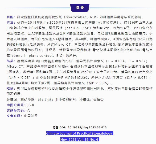 利伐沙班對(duì)種植體早期骨結(jié)合影響研究 來(lái)源:本站 時(shí)間:2024-01-10 00:00:00