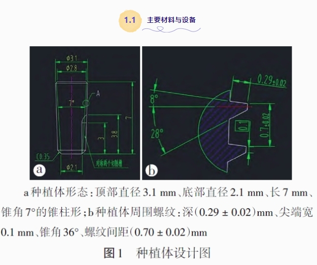 99.99%純鈦種植體(威海市威高集團(tuán)有限公司),種植體設(shè)計(jì)圖見(jiàn)圖1;RIV(上海源葉生物科技有限公司);ASP(阿斯利康,英國(guó));丙泊酚(西安力邦制藥有限公司);咪達(dá)唑侖(杭州瑞太醫(yī)藥科技有限公司);鹽酸阿替卡因(碧蘭,法國(guó));恩諾沙星注射液(拜爾,德國(guó));Micro-CT(μCT-100,SCANCO Medical AG,瑞士);硬組織切磨系統(tǒng)(EXAKT,德國(guó))。