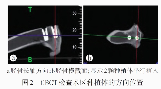 3組白兔術(shù)前12 h禁飲食。使用咪達(dá)唑侖、丙泊酚行耳緣靜脈注射麻醉。白兔仰臥于無(wú)菌手術(shù)臺(tái)上,備皮、消毒、鋪巾。再使用1.7 mL的4%鹽酸阿替卡因局部麻醉,以防止術(shù)中白兔出現(xiàn)后肢抽搐。選擇白兔雙腿膝關(guān)節(jié)內(nèi)側(cè)近干骺端作為切口縱向切開(kāi)約20 mm,翻瓣,暴露脛骨干骺端,每條腿兩植入點(diǎn)間隔約3 mm,球鉆定位,轉(zhuǎn)速為1200 r/min,先鋒鉆預(yù)備深約5 mm,擴(kuò)孔鉆逐級(jí)預(yù)備直徑3.3 mm、深約8 mm的窩洞,術(shù)中不斷以生理鹽水冷卻降溫,最終以5 ~ 10 N·cm的扭力在發(fā)育線兩側(cè)各植入1顆99.99%純鈦種植體,種植體頂端位于骨面下1 mm??晌湛p合線分層縫合創(chuàng)口,消毒術(shù)區(qū),術(shù)后注射恩諾沙星注射液預(yù)防感染。術(shù)區(qū)拍攝錐形束CT(cone beam CT,CBCT),確認(rèn)種植體的三維位置(圖2)。術(shù)后8 h實(shí)驗(yàn)動(dòng)物按原分組的灌胃方式繼續(xù)飼養(yǎng)。為保證第2、4周每組白兔及種植體數(shù)量一致,且每組種植體數(shù)量不少于3顆,按如下方法行后續(xù)實(shí)驗(yàn):在第2、4周分別選取每組2只白兔的8顆種植體行后續(xù)研究,其中3顆種植體及周?chē)M織行Micro-CT掃描及三維模型重建,其余5顆種植體及周?chē)M織制作種植體-骨組織標(biāo)本并進(jìn)行組織學(xué)染色。