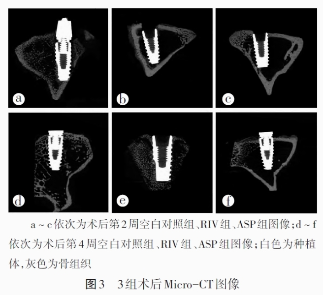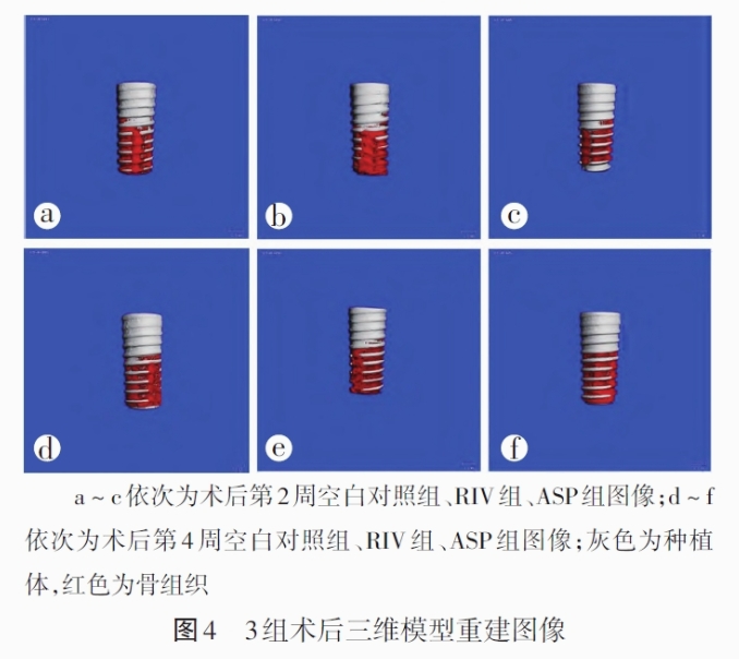 術(shù)后第2周,Micro-CT及三維模型重建圖像可見(jiàn)3組種植體螺紋內(nèi)均有新生骨長(zhǎng)入;空白對(duì)照組、RIV組分別與ASP組相比,新生骨小梁密度均較高。術(shù)后第4周情況與第2周類(lèi)似,但3組骨小梁密度及骨量均較第2周時(shí)明顯增高。見(jiàn)圖3 ~ 4。