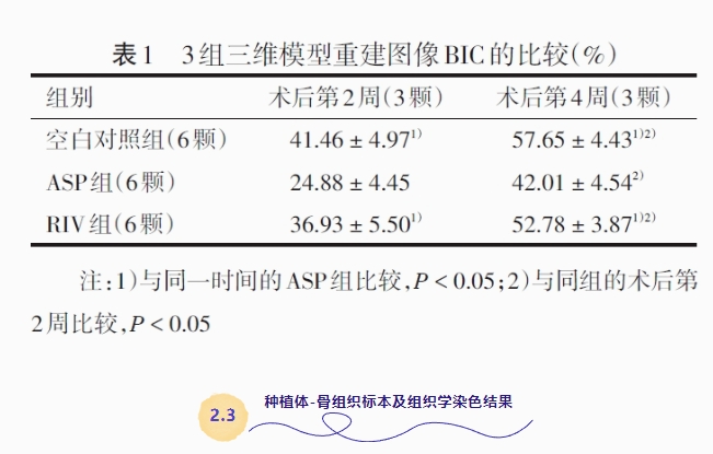 3組三維模型重建圖像BIC的比較結(jié)果顯示,隨著時(shí)間的延長(zhǎng),3組BIC逐漸升高(F = 55.812,P < 0.001);不同測(cè)量時(shí)間點(diǎn)3組BIC的比較,差異有統(tǒng)計(jì)學(xué)意義(F = 19.007,P < 0.001);且隨著時(shí)間的延長(zhǎng)差異無(wú)明顯變化(F = 0.031,P = 0.970)。其中術(shù)后第2、4周,空白對(duì)照組及RIV組的BIC均大于ASP組,差異均有統(tǒng)計(jì)學(xué)意義(均P < 0.05);而空白對(duì)照組與RIV組BIC的比較,差異無(wú)統(tǒng)計(jì)學(xué)意義(P > 0.05);且每組第4周的BIC均大于第2周,差異均有統(tǒng)計(jì)學(xué)意義(均P < 0.05)。見(jiàn)表1。