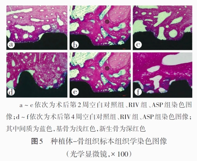 可清晰觀察到新生骨與基骨之間的界限,細(xì)長(zhǎng)的新生骨小梁相互交織,且大部分位于種植體螺紋腔內(nèi)。間質(zhì)內(nèi)有較多成骨細(xì)胞、成纖維細(xì)胞、血管及類(lèi)骨質(zhì)??瞻讓?duì)照組和RIV組相對(duì)于ASP組新生骨小梁較多,主要集中于種植體螺紋側(cè)壁上。術(shù)后第4周相較于第2周種植體周?chē)律橇考肮切×好芏让黠@增加。見(jiàn)圖5。