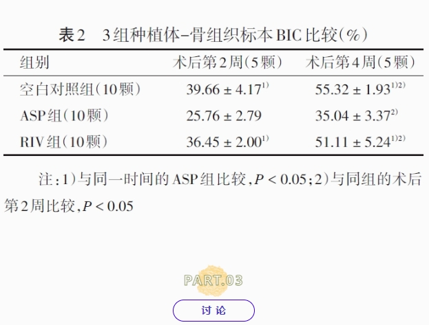 3組染色圖像BIC的比較結(jié)果顯示,隨著時(shí)間的延長(zhǎng),3 組BIC 逐漸升高(F = 109.380,P <0.001);不同測(cè)量時(shí)間點(diǎn)3組BIC的比較,差異有統(tǒng)計(jì)學(xué)意義(F = 67.609,P < 0.001);且隨著時(shí)間的延長(zhǎng)差異無(wú)明顯變化(F = 2.459,P = 0.107)。其中術(shù)后第2、4周,空白對(duì)照組及RIV組的BIC均大于ASP組,差異均有統(tǒng)計(jì)學(xué)意義(均P < 0.05);而空白對(duì)照組與RIV組BIC的比較,差異無(wú)統(tǒng)計(jì)學(xué)意義(P > 0.05)。且3組第4周BIC均大于第2周,差異均有統(tǒng)計(jì)學(xué)意義(均P < 0.05)。見(jiàn)表2。