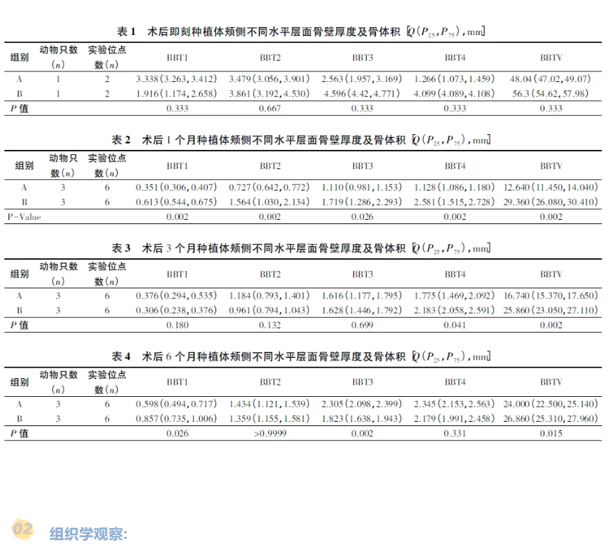 ②種植體頰側(cè)骨壁體積( buccal bone volume,BBV) 。( 3) 組織學(xué)觀察: 標(biāo)本經(jīng)脫水包埋后,沿頰舌向縱向切割為200 μm 切片,依次研磨至20 ~30 μm,然后進(jìn)行Levai-Laczko 染色過(guò)程,形成最終切片,進(jìn)行觀察。