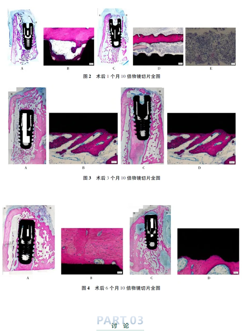 10 倍物鏡采集切片全圖,種植體、頰舌側(cè)骨壁及軟組織均完整可見(jiàn)。術(shù)后1 個(gè)月A 組: 種植體頰側(cè)附著有新生編織骨結(jié)構(gòu),內(nèi)部骨細(xì)胞排列不規(guī)則,少量成骨細(xì)胞可見(jiàn),如圖2A、B。B組: 種植體頰側(cè)覆蓋大量淋巴細(xì)胞,其外表面為原宿主板層骨結(jié)構(gòu),如圖2C~E。術(shù)后3 個(gè)月A 組: 種植體頰側(cè)新生編織骨組織中骨細(xì)胞排列規(guī)則程度提高,如圖3A、B。B 組: 種植體頰側(cè)附著新生編織骨,骨細(xì)胞排列均較為紊亂,如圖3C、D。術(shù)后6 個(gè)月A、B 兩組均可見(jiàn)種植體頰側(cè)粉色成熟板層骨結(jié)構(gòu),如圖4A~D。